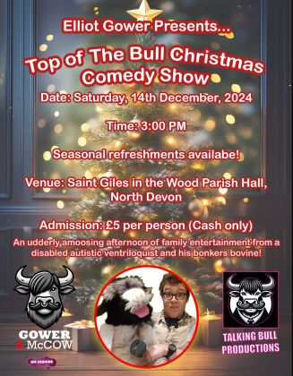 Top of the Bull Christmas Comedy Show – St Giles in the Woods Parish Hall, North Devon – Saturday, 4th December 2024 – 3pm