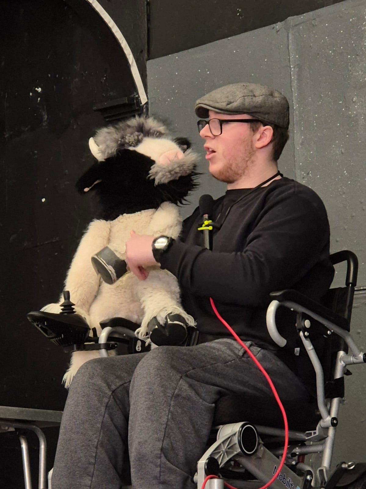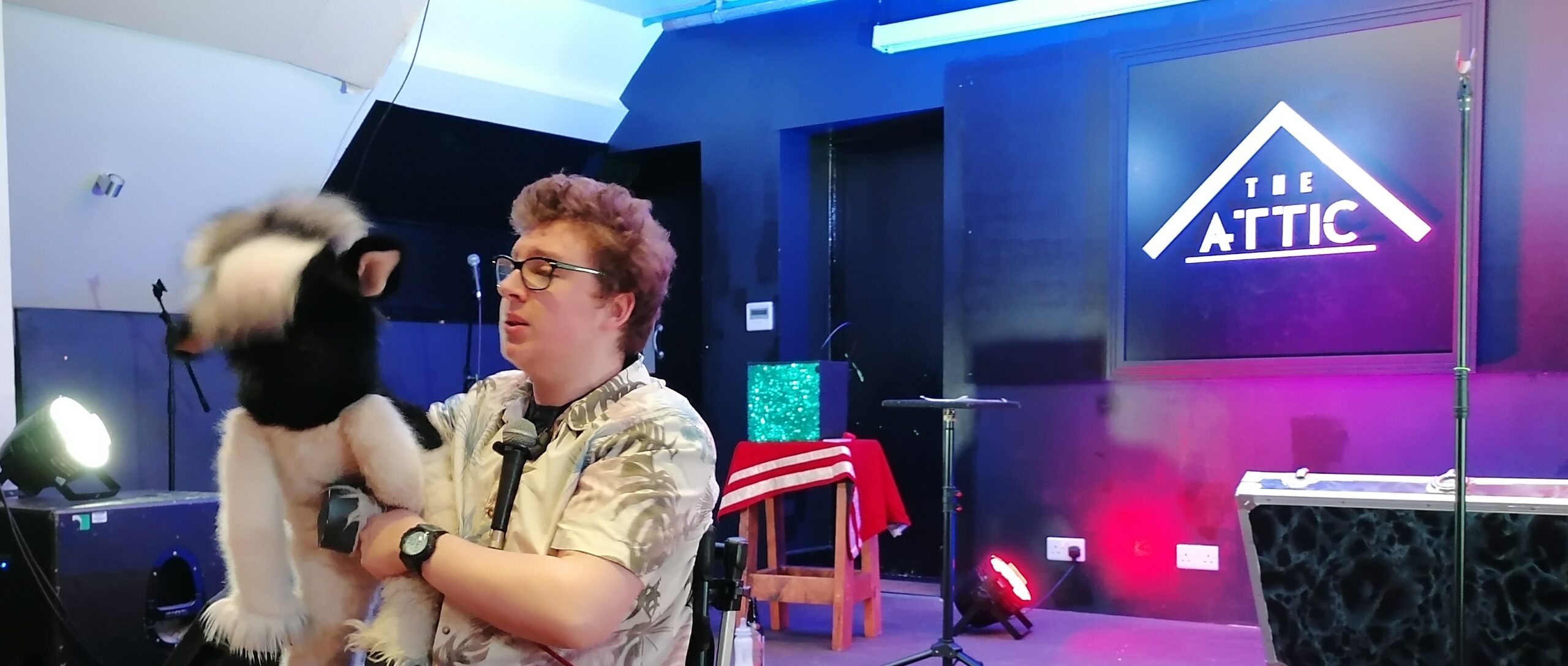 Elliot is articulate, quick-witted, and a master of puppetry and Ventriloquism. His story began when he was at school using a small stuffed toy Cow to “speak” for him during moments of anxiety when he was younger. He often cites the toy as his imaginary friend – his only friend. As he became older, the toy became a professionally made puppet. He used humour to mask his anxiety, and soon, the anxiety transformed into Elliot having fun with his tutors and fellow students alike.